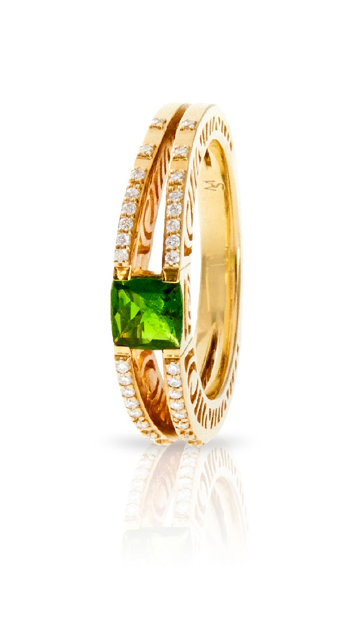 Crafted in 14k yellow gold with 32 diamonds totaling 0.134ct and a 0.5ct square Chrome Diopside. Standard ring size: 7. Customization available upon request.