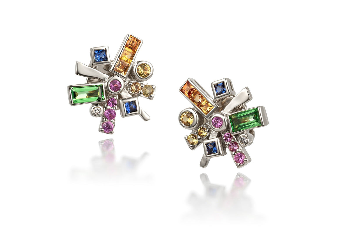 Crafted in gold with multi-color sapphires, tsavorites, and diamonds. Earring size: 11.6 x 12.4mm.