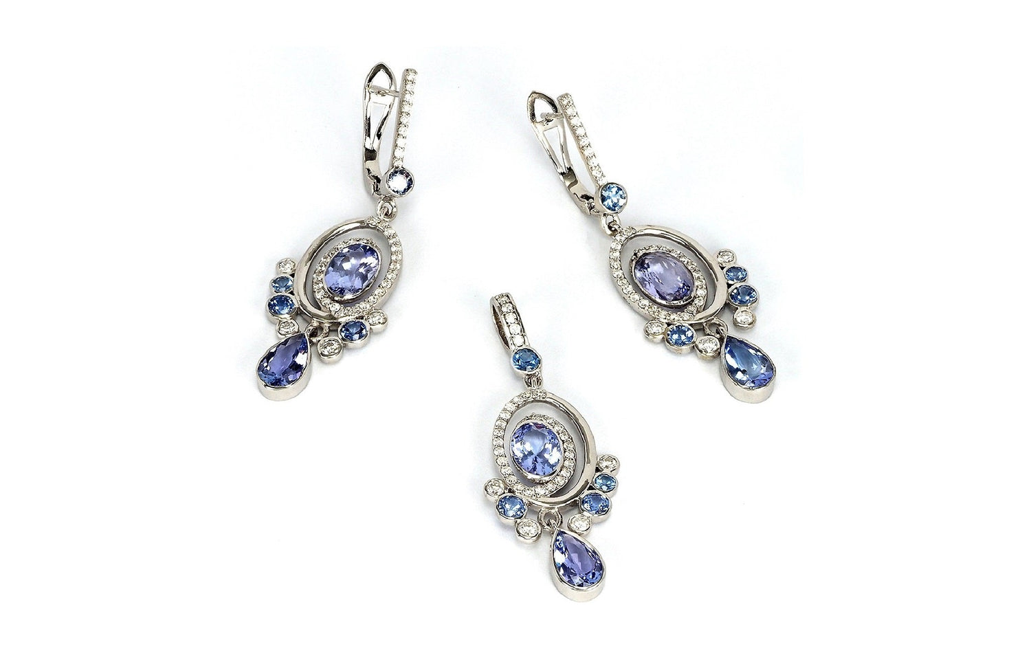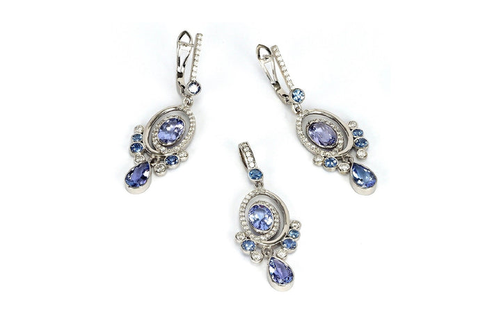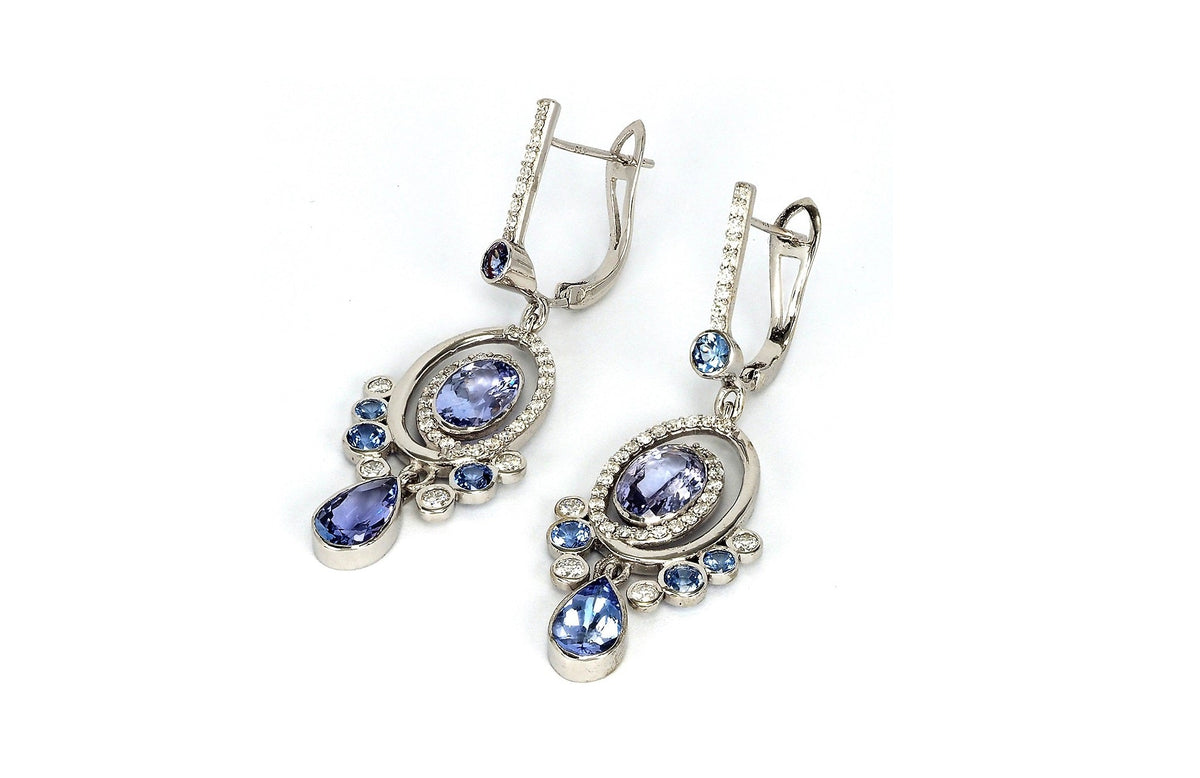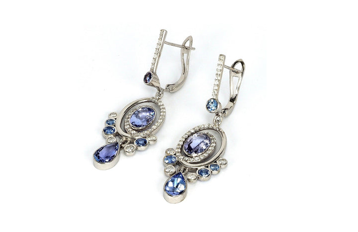 Crafted in 18k white gold with tanzanites, sapphires, and diamonds. Earring size: 1.11' L x 0.5' W. Center oval stone: 8mm x 5.7mm. Customizable with other gemstones upon request.