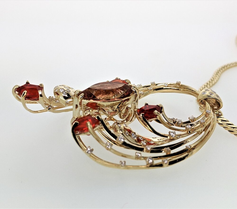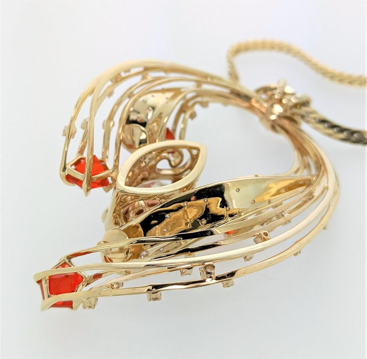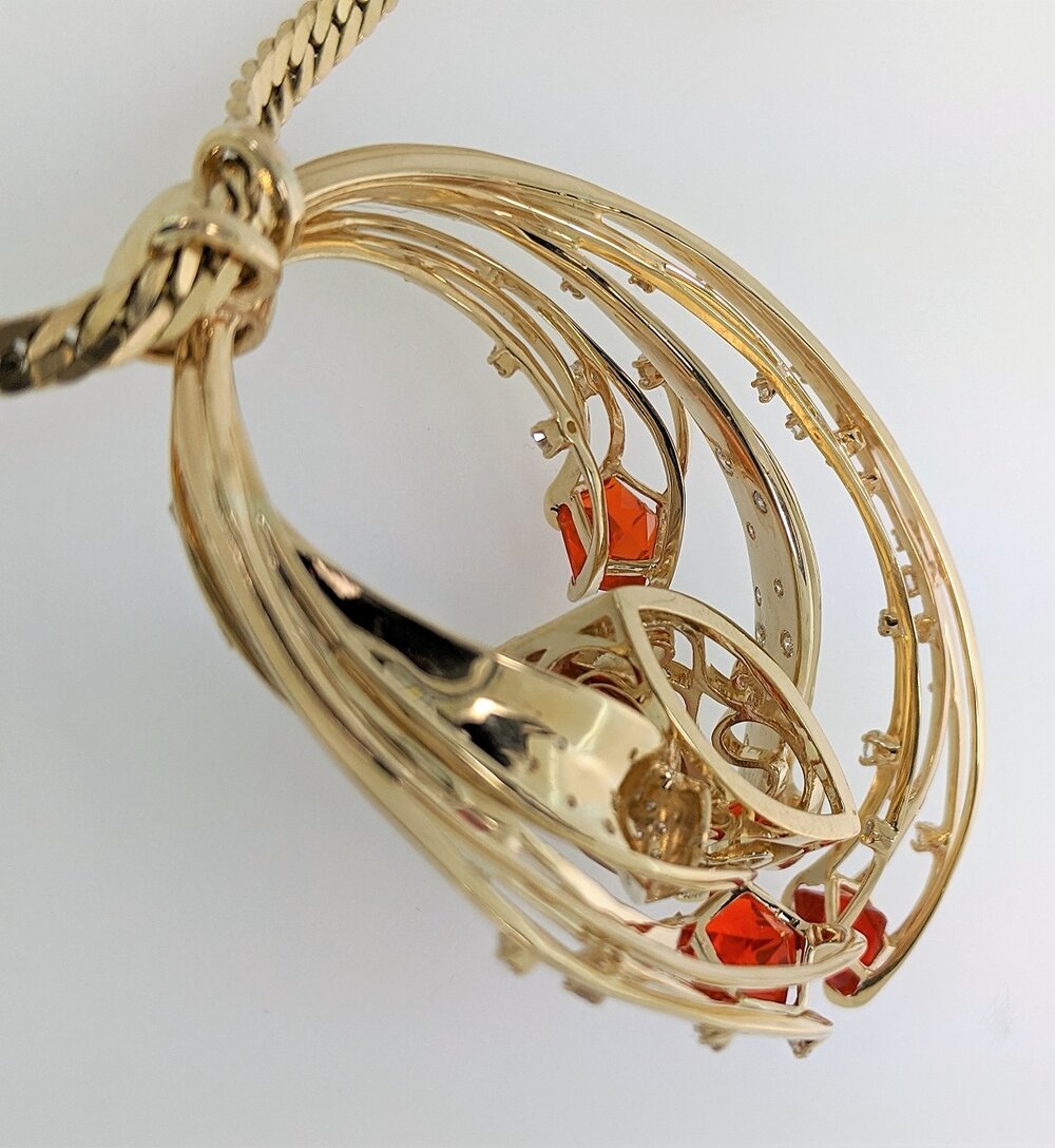Crafted in 14k yellow gold with a 20 x 9mm marquise Oregon Sunstone, 1.6ct diamond melee, and four fire opals (various sizes). Weighs 24.38 grams. Optional 3.25mm wide, 20” long flat curb chain (10.78 DWT).