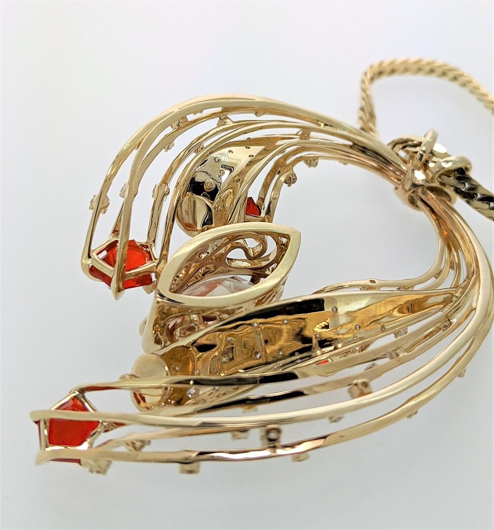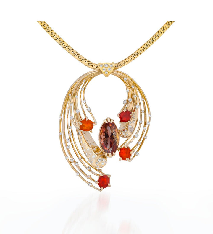 This Comet Pendant 'Convergence' by Martha Seely symbolizes unity and coming together, featuring a stunning marquise Oregon Sunstone at the center, surrounded by fiery opals and diamonds. It can also be transformed into a brooch for versatility, perfect for adding a bold touch to your wardrobe.