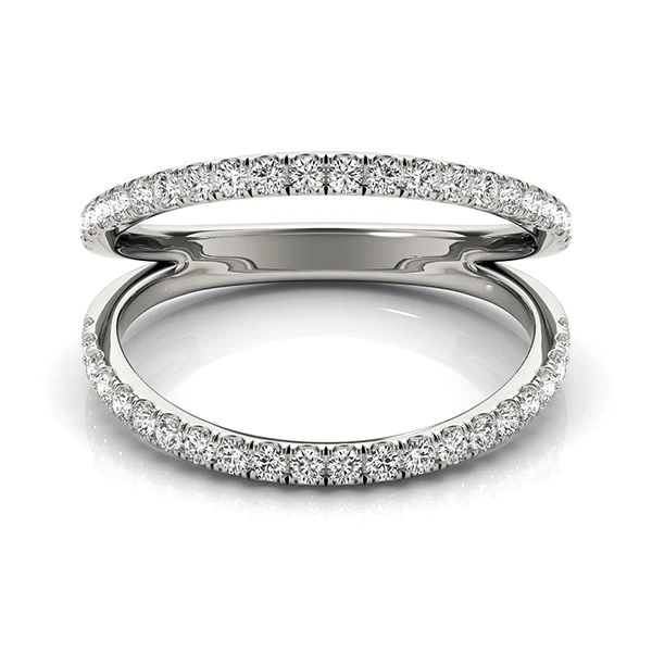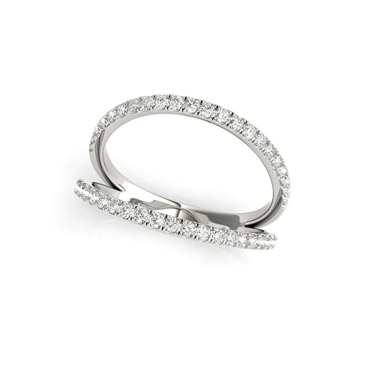 Utterly stunning in 14k white gold, this ring features pavé set diamonds. A delightful beauty with a fashionable dual-band design.