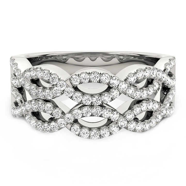 Two pairs of interlocking waves of diamonds, set in 14k white gold which adds dynamic energy to this elegant ring.