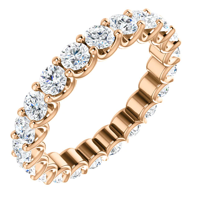 This eye-catching ring sparkles with moissanite set in delicately sculpted shared prongs to maximize the fire and brilliance of the gems. The perfect ring to stack with or wear solo.