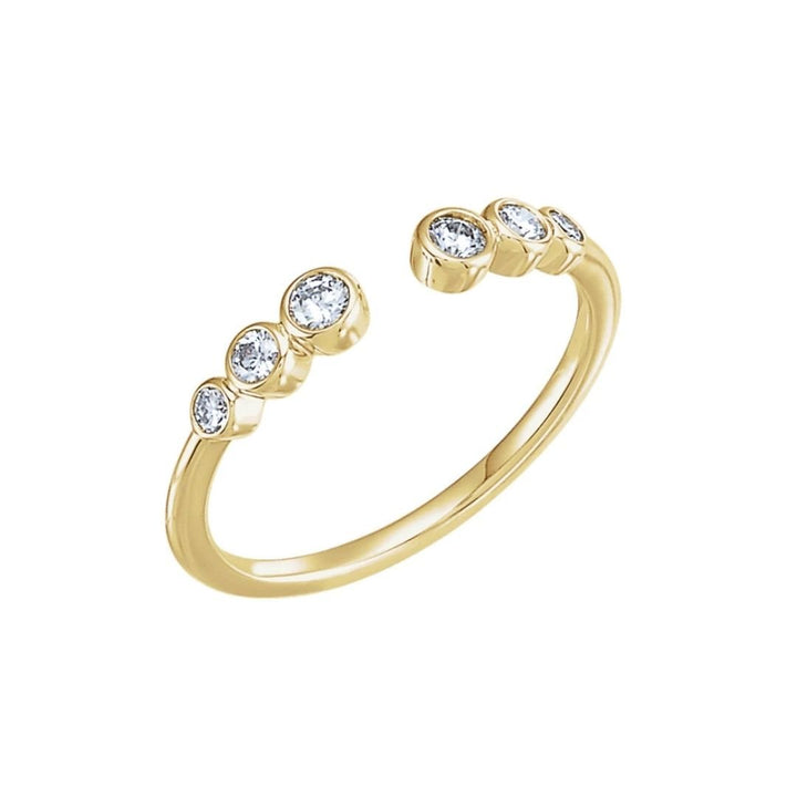 Slim and chic, this ring is the perfect combination of vintage-inspired and modern design. This minimalist choice showcases a trio of sparkling diamonds on each side of the open shank. This style is one you will want to wear with everything.