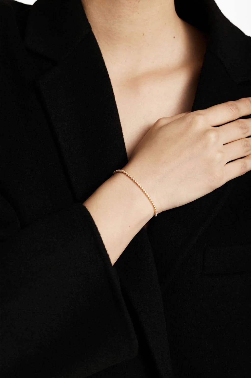 The Diamond Tennis Bracelet is a timeless choice for everyday layering. This delicate piece is made from solid 14k yellow gold accented with 83 white diamonds for a total of 1 carat. Finished with a traditional bracelet catch closure.