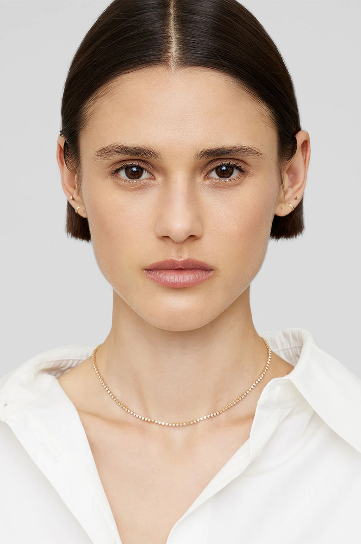 The Diamond Tennis Necklace is made from solid 14k yellow gold accented with 166 white diamonds. It features an adjustable chain fixed to a chain extender for a customizable fit. Finished with a lobster clasp closure.