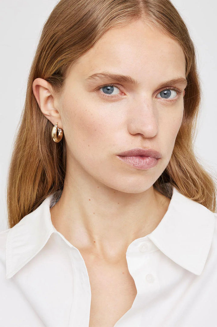 A capsule collection of vintage statement hoops in 14k gold curated by Anine. Vintage and available in limited quantities. The Two Tone Ribbed Hoop Earrings are crafted from hollow 14k yellow gold with subtle 14k white gold detailing. Finished with a traditional latch back closure. Sold as a pair.