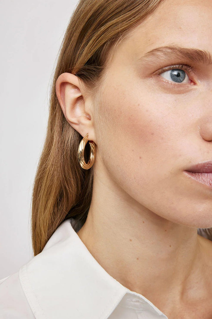 A capsule collection of vintage statement hoops in 14k gold curated by Anine. Vintage and available in limited quantities. The Twist Hoop Earrings are crafted from hollow 14k yellow gold and feature an elegant twisted design. Finished with a traditional latch back closure. Sold as a pair.