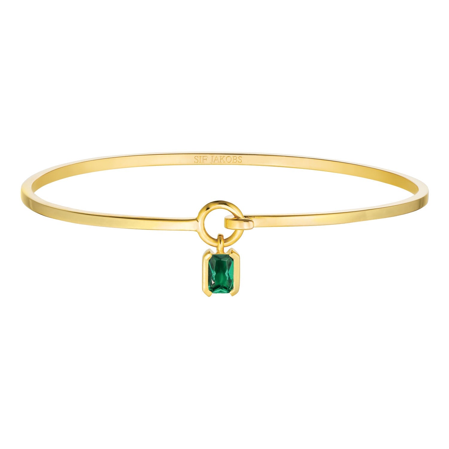 This Roccanova Bangle by Sif Jakobs is an architectural marvel of vibrant elegance. With its clean form and emerald cut green zirconia, it conveys strength and clarity. The polished gold finish highlights its rich tones, making it a sophisticated companion to the matching earrings or a bold solo accent.