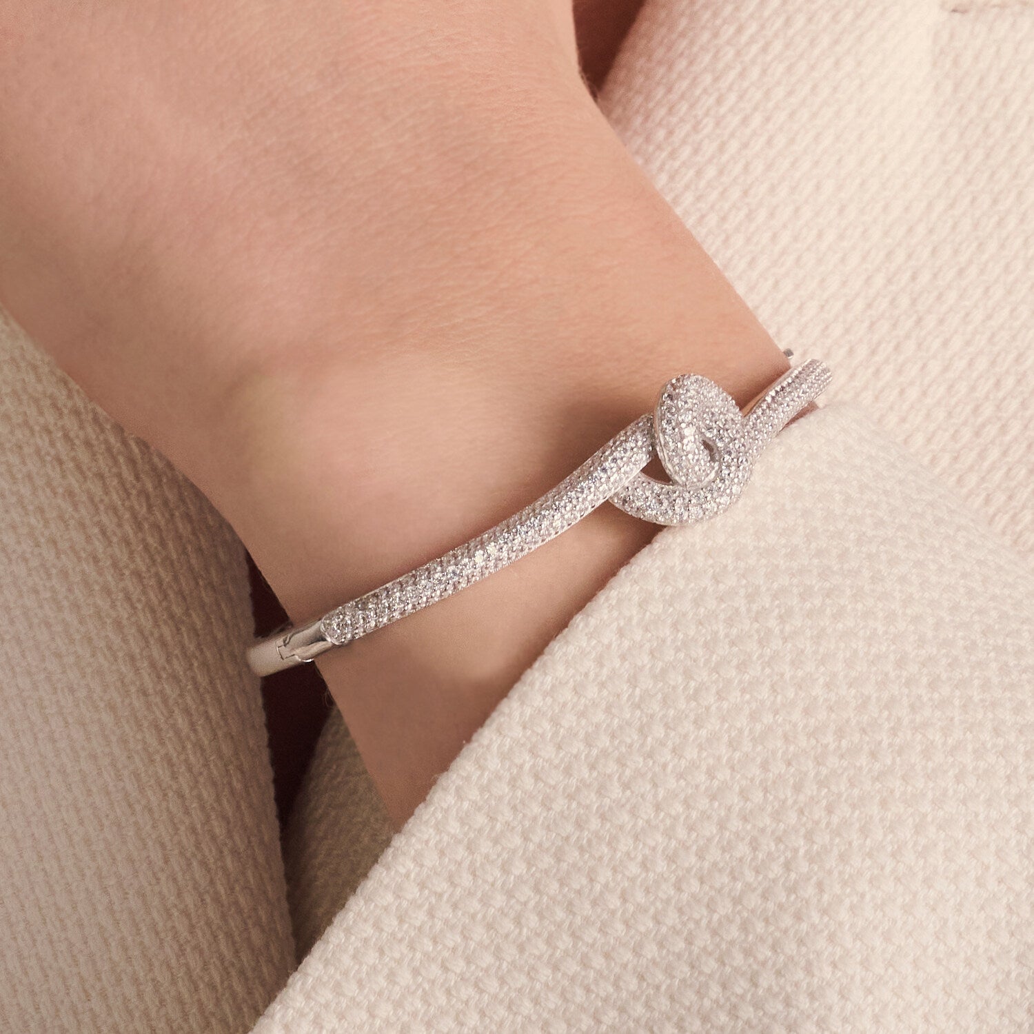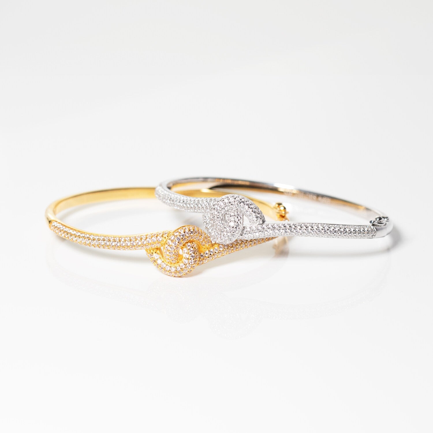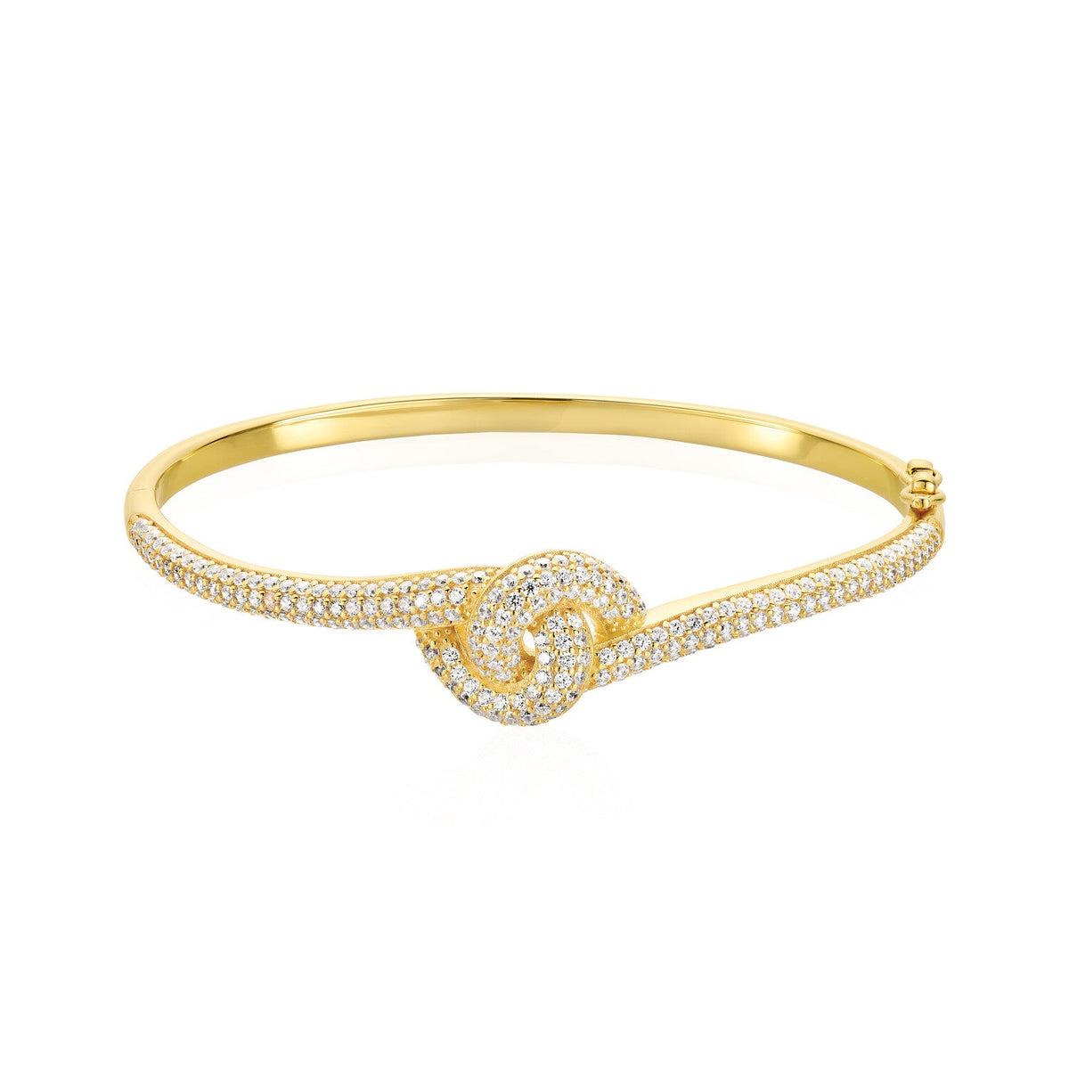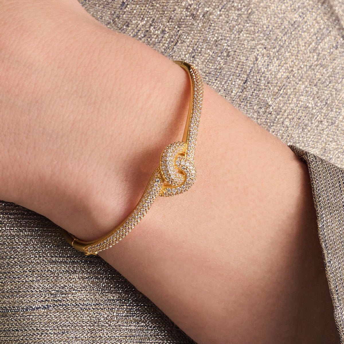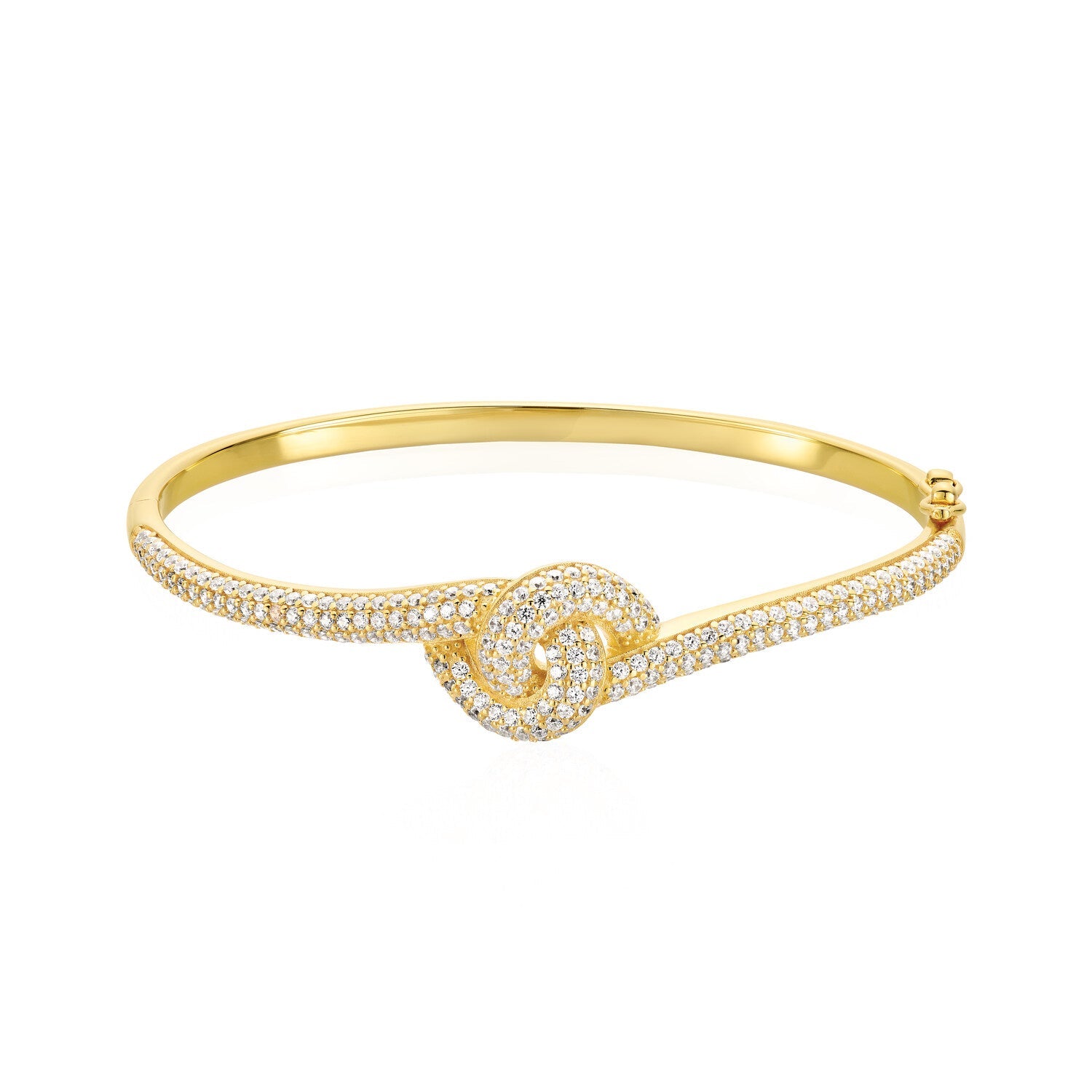 Handcrafted in 18-karat gold plated 925 Sterling silver with a polished finish and handset white facet cut zirconia. Bangle diameter 13 mm.