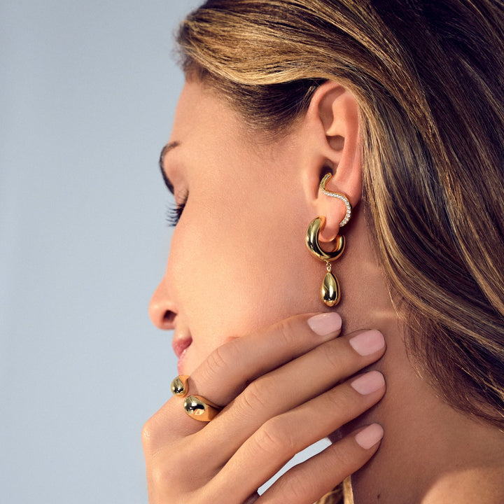 These Earrings Goccia Pendolo Pianura by Sif Jakobs elongate the elegance of the Goccia silhouette into a pendant form. Their fluid drop design captures the grace of a golden teardrop in motion, creating a statement of modern femininity and sleek allure.