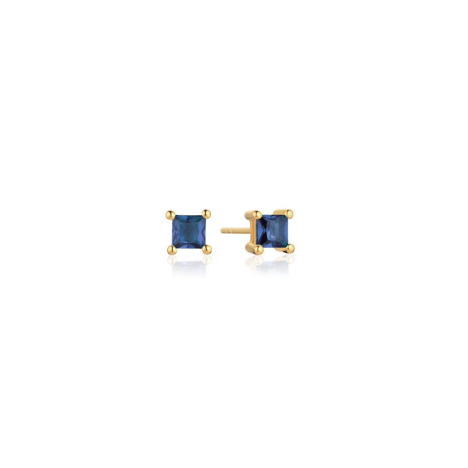 Made of 18-karat gold plated 925 Sterling Silver with a polished surface and facet cut blue zirconia. Height: 4 mm; Width: 1.8 mm.