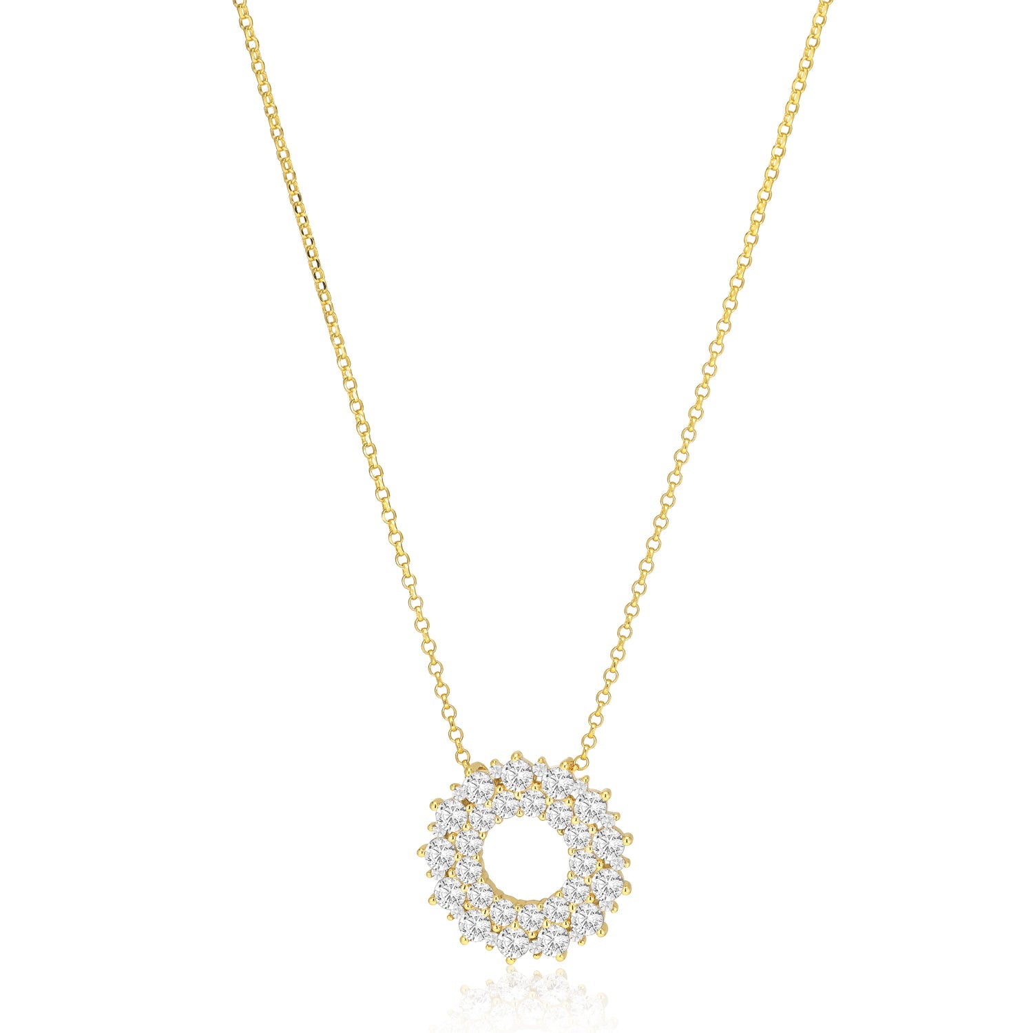 Handcrafted in 18-karat gold plated 925 Sterling silver with a polished finish and handset multicoloured facet cut zirconia. Pendant diameter 18.5 mm, thickness 2.7 mm, adjustable chain up to 45 cm.