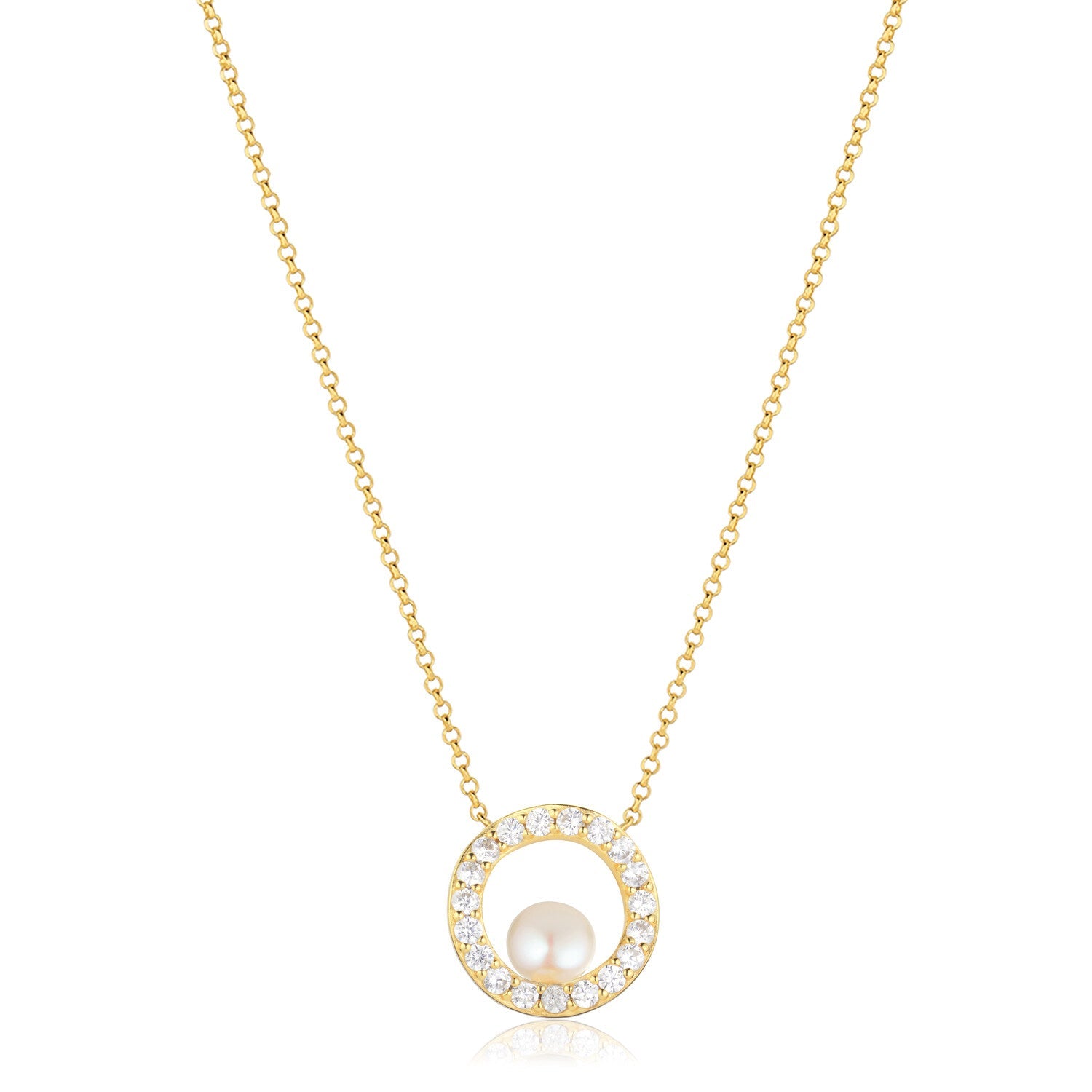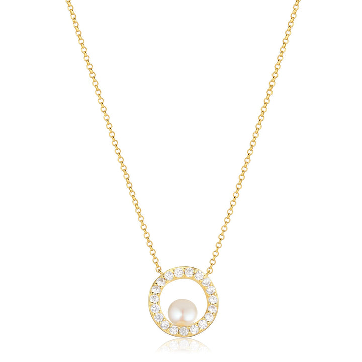 Handcrafted in 18-karat gold plated 925 Sterling silver with a polished finish, handset white facet cut zirconia and freshwater pearls. Pendant diameter 15 mm, width 2.3 mm, thickness 1.8 mm, adjustable chain up to 45 cm.