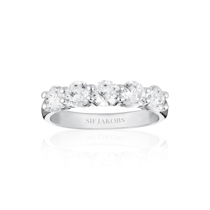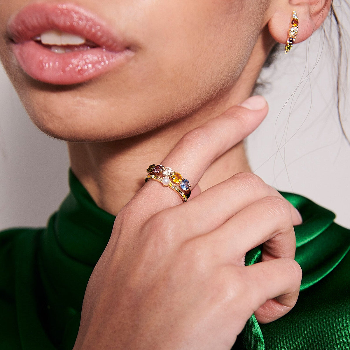 This Ring Belluno Uno by Sif Jakobs wraps the finger in a rainbow of radiance. With its fine band and vivid multicoloured zirconia, it’s a joyful accent full of personality—designed to layer, stack, or shine on its own.