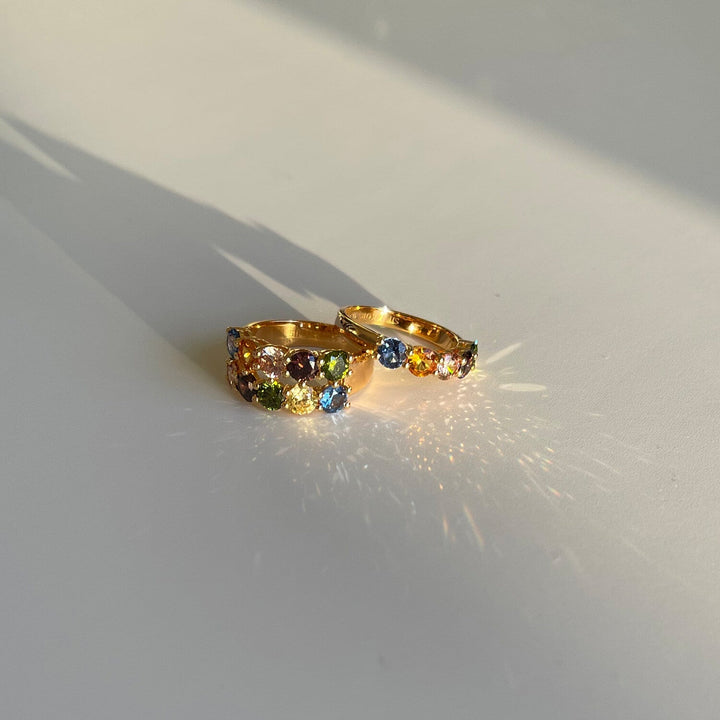 Made of 18-karat gold plated 925 Sterling Silver with a polished surface and facet cut multicoloured zirconia. Width: 4.5 mm; Thickness: 1.2 mm.