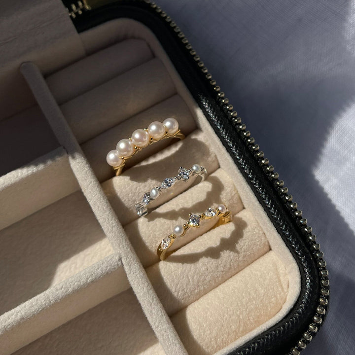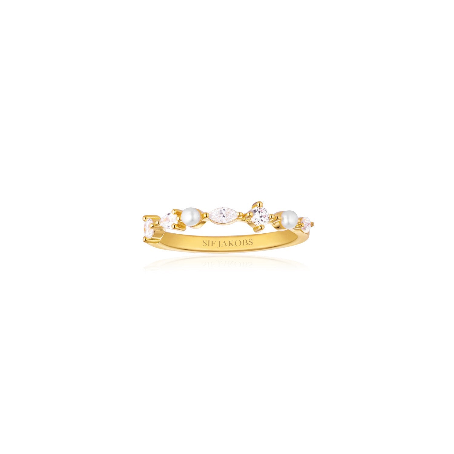 This Ring Adria by Sif Jakobs brings together soft luster and sparkling brilliance. The band is adorned with white zirconia and a single freshwater pearl, blending romantic softness with sleek modern styling.
