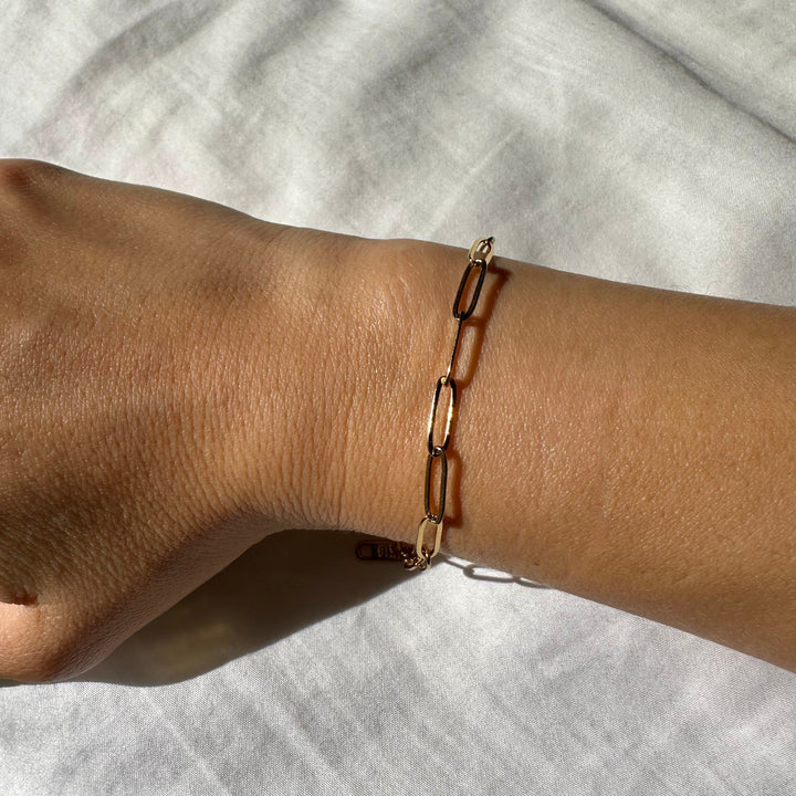 This Candace Bracelet by Adrianne Marie is a modern classic, showcasing the timeless appeal of a paperclip chain. Its minimalist design lends effortless sophistication to any ensemble, making it an essential piece for both everyday wear and special occasions.