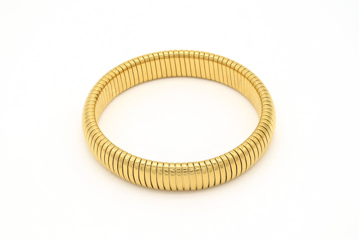Set of stretch cuff bangles in gold-tone metal. All Adrianne Marie pieces are crafted with 18k gold PVD over stainless steel