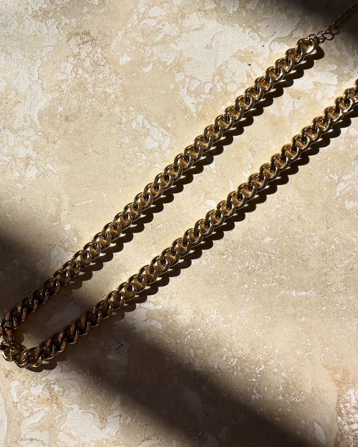 This Lea Necklace by Adrianne Marie commands attention with its striking chunky chain, ideal for bold styling statements. Versatile enough to wear alone for dramatic impact or layered for additional depth, it is the ultimate accessory for those seeking a contemporary and confident aesthetic.