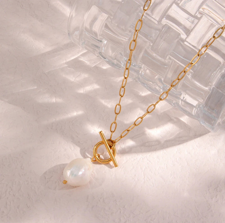 This Esme Necklace by Adrianne Marie masterfully blends elegance and modernity. Featuring a chic paperclip chain, toggle clasp, and lustrous pearl pendant, it adds a luxurious yet contemporary edge. A versatile piece that transitions seamlessly from day to evening, it's perfect for those who seek sophisticated style with a fashion-forward edge.