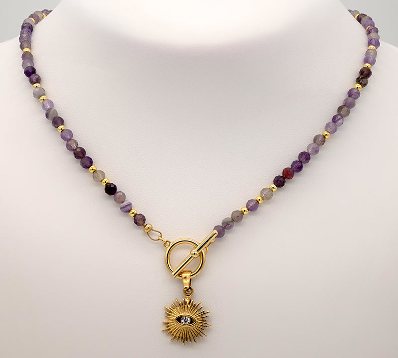Necklace with purple beads. Chain length measures 18 inches. All Adrianne Marie pieces are crafted with 18k gold PVD over stainless steel