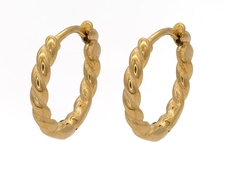 High-polish gold-tone metal with a twist braid design. Huggie clasp closure. All Adrianne Marie pieces are crafted with 18k gold PVD over stainless steel