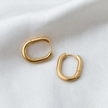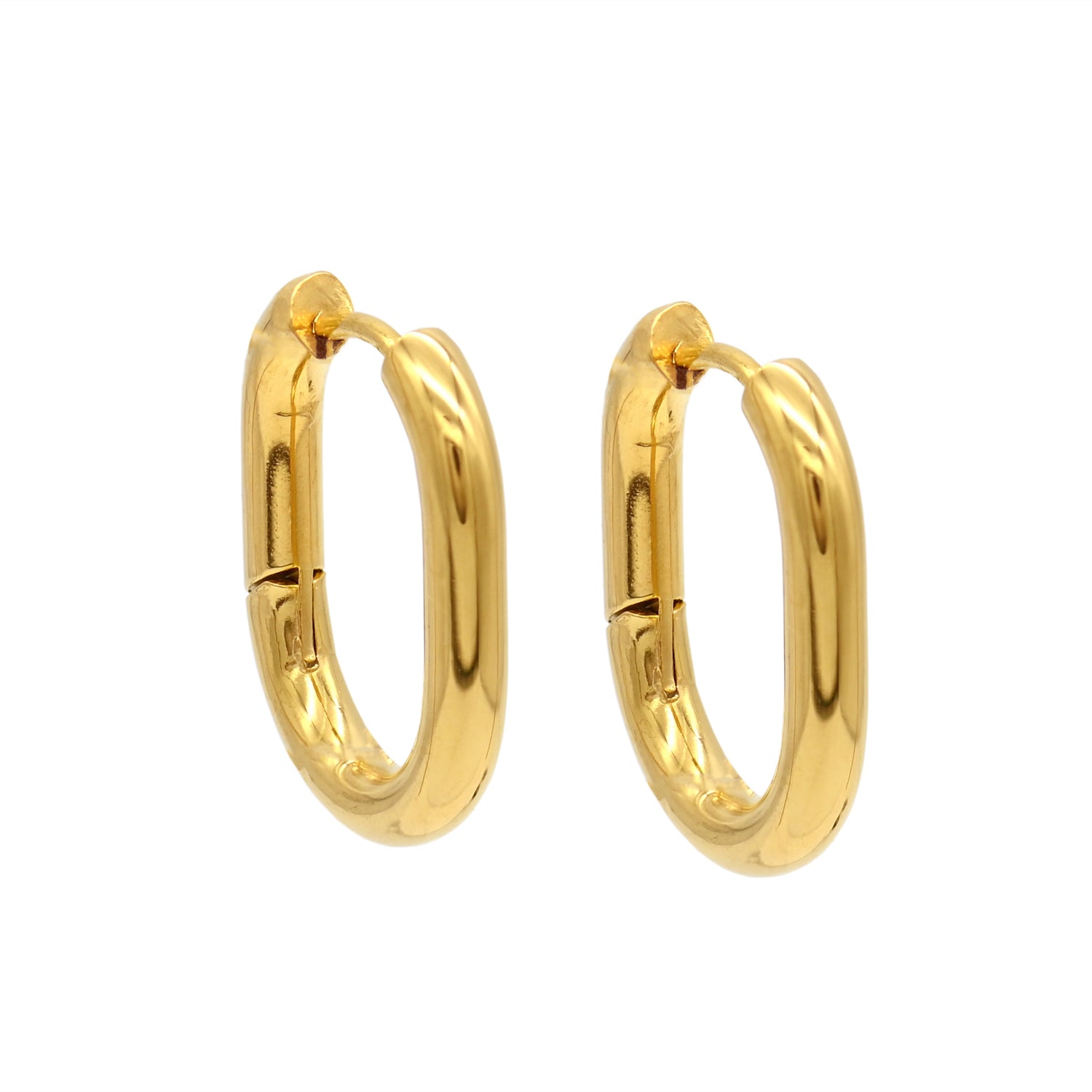 Gold-tone metal, 14mm oval huggie shape. Hinge clasp for secure fit. All Adrianne Marie pieces are crafted with 18k gold PVD over stainless steel