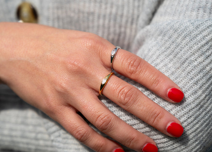 The Maddi Crystal Eye Ring by Adrianne Marie radiates simple elegance with a mystical twist. A single marquise-cut CZ sparkles at the center like a guiding star, creating a clean yet meaningful design. Sleek enough for daily wear and striking enough for night outs, Maddi is a subtle stunner.