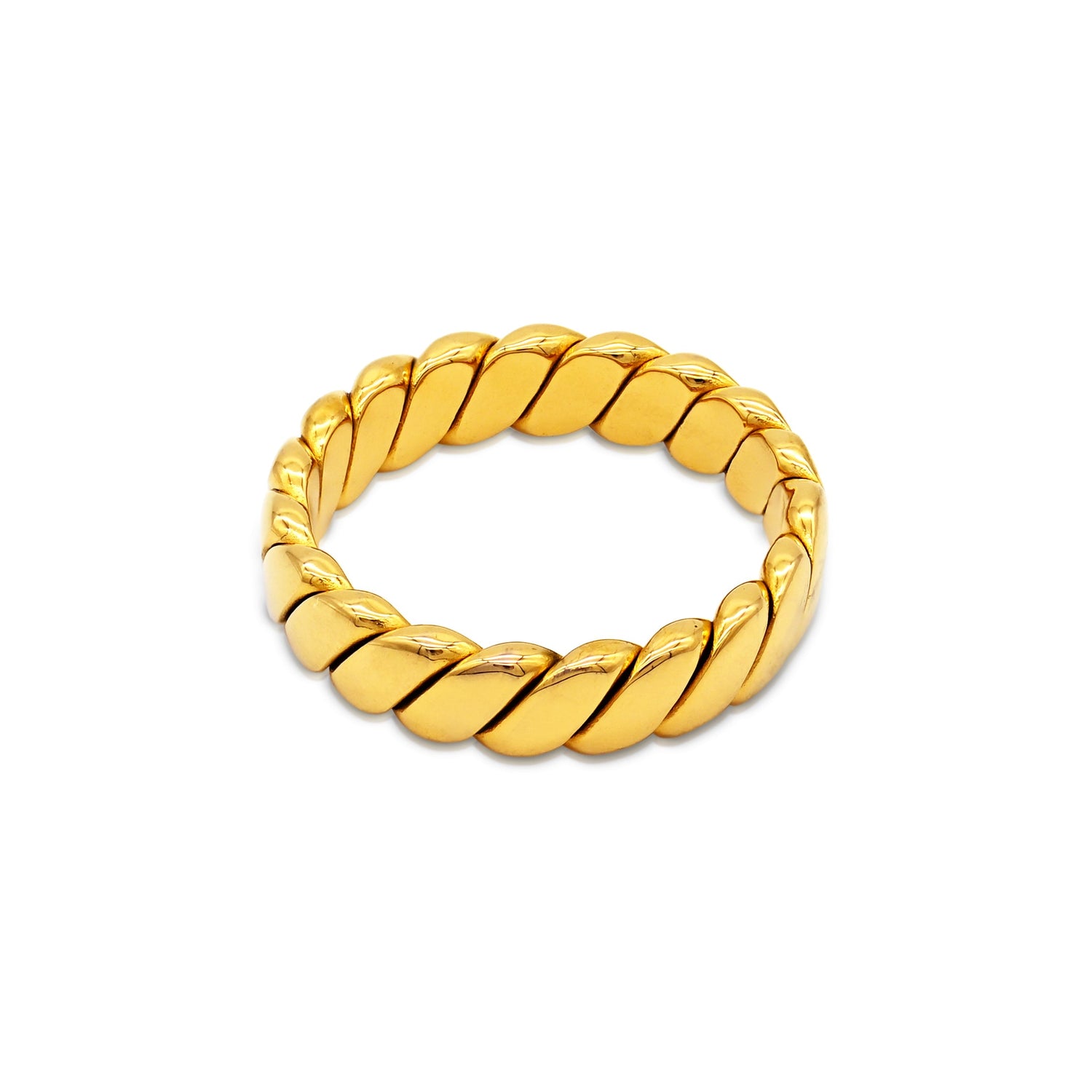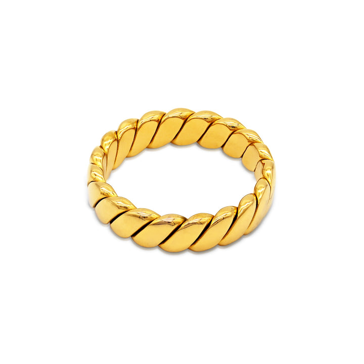 Gold-tone twisted rope design. Size 6. Polished, chunky band. All Adrianne Marie pieces are crafted with 18k gold PVD over stainless steel