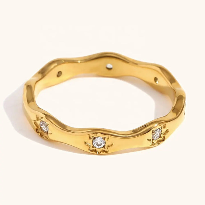 The Starlight Eternity Ring by Adrianne Marie dazzles with celestial charm. A radiant row of CZ-encrusted stars circles the band, symbolizing infinite beauty and cosmic connection. Feminine, symbolic, and unforgettable, this ring is a promise to shine endlessly.