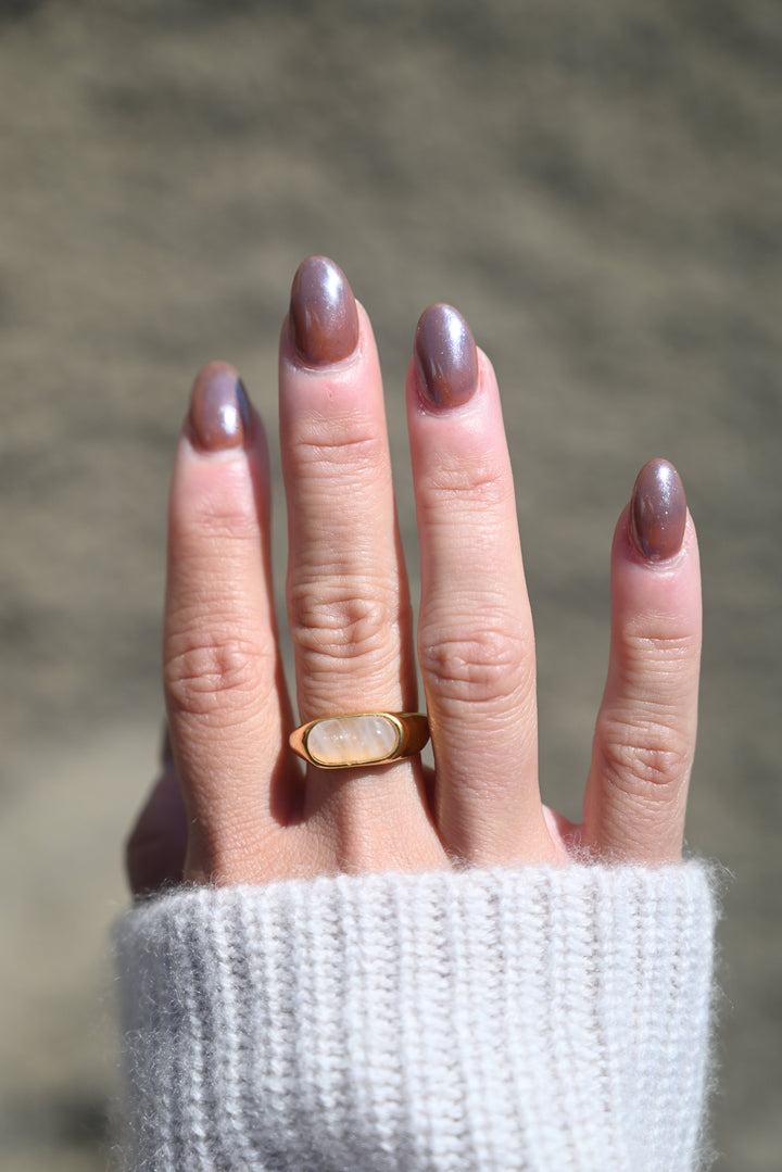 Chunky gold-tone band with rose quartz stone. Size 6. Statement ring. All Adrianne Marie pieces are crafted with 18k gold PVD over stainless steel