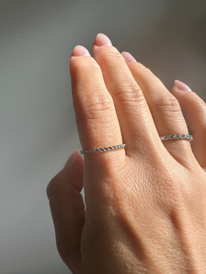 This Christy Ring by Adrianne Marie is a delicate braided band that exudes understated elegance. Its woven design speaks to themes of unity and connection, while its minimalist silver finish allows for endless styling potential. A refined staple for everyday luxury.