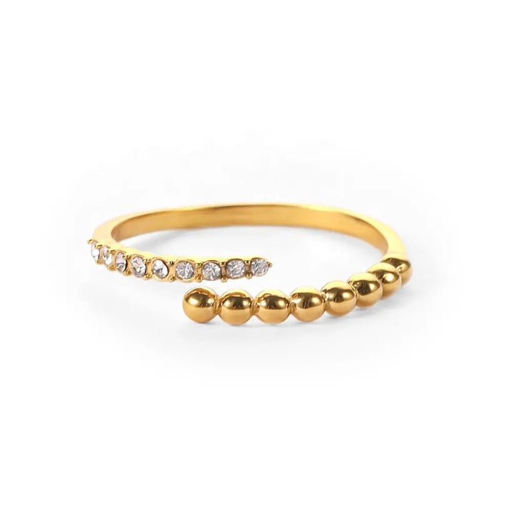 This Emily Ring by Adrianne Marie radiates grace with its delicate open silhouette, adorned with sparkling cubic zirconia and fine beaded accents. Its light, airy presence brings a subtle touch of glamour to everyday outfits, symbolizing both elegance and modern femininity.
