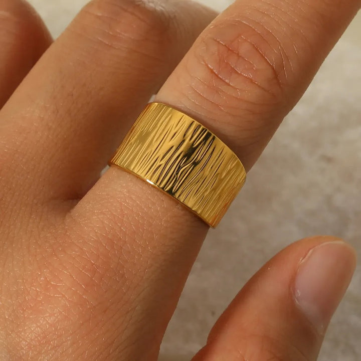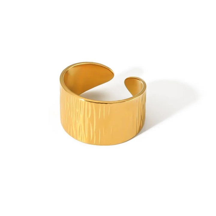 Hammered gold-tone metal. Open, adjustable sizing. All Adrianne Marie pieces are crafted with 18k gold PVD over stainless steel