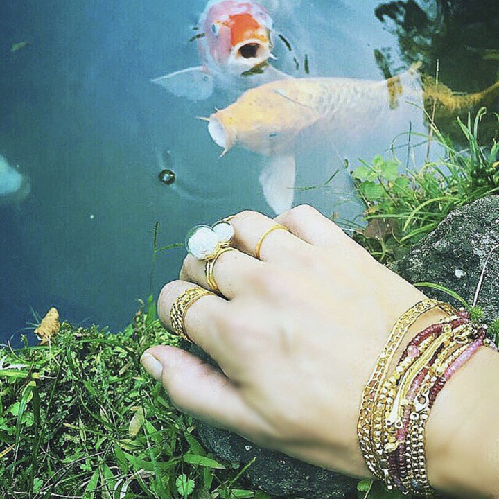 This Gemstone Fade Bracelet by Catherine Weitzman is an understated beauty with luminous detail. Featuring white mystic topaz rondelles that fade into faceted gold vermeil beads, this bracelet balances sparkle and subtlety with elegance. A lovely choice for bridal styling or everyday layering.