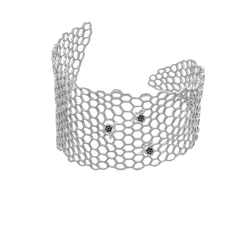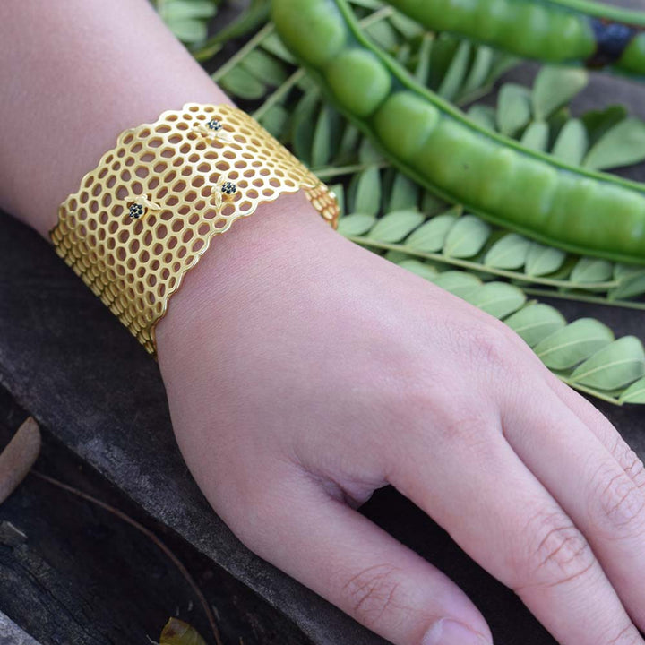 This Honeycomb with Bees Cuff Bracelet by Catherine Weitzman is a celebration of nature’s delicate architecture. With a textured honeycomb and crystal-studded bees, it makes an elegant yet playful statement. Ideal for Earth Day and beyond. Handmade in Hawaii.