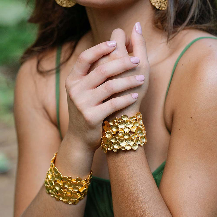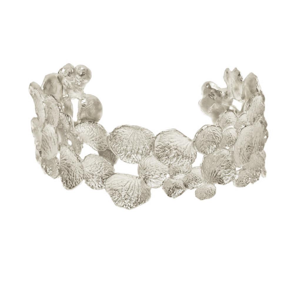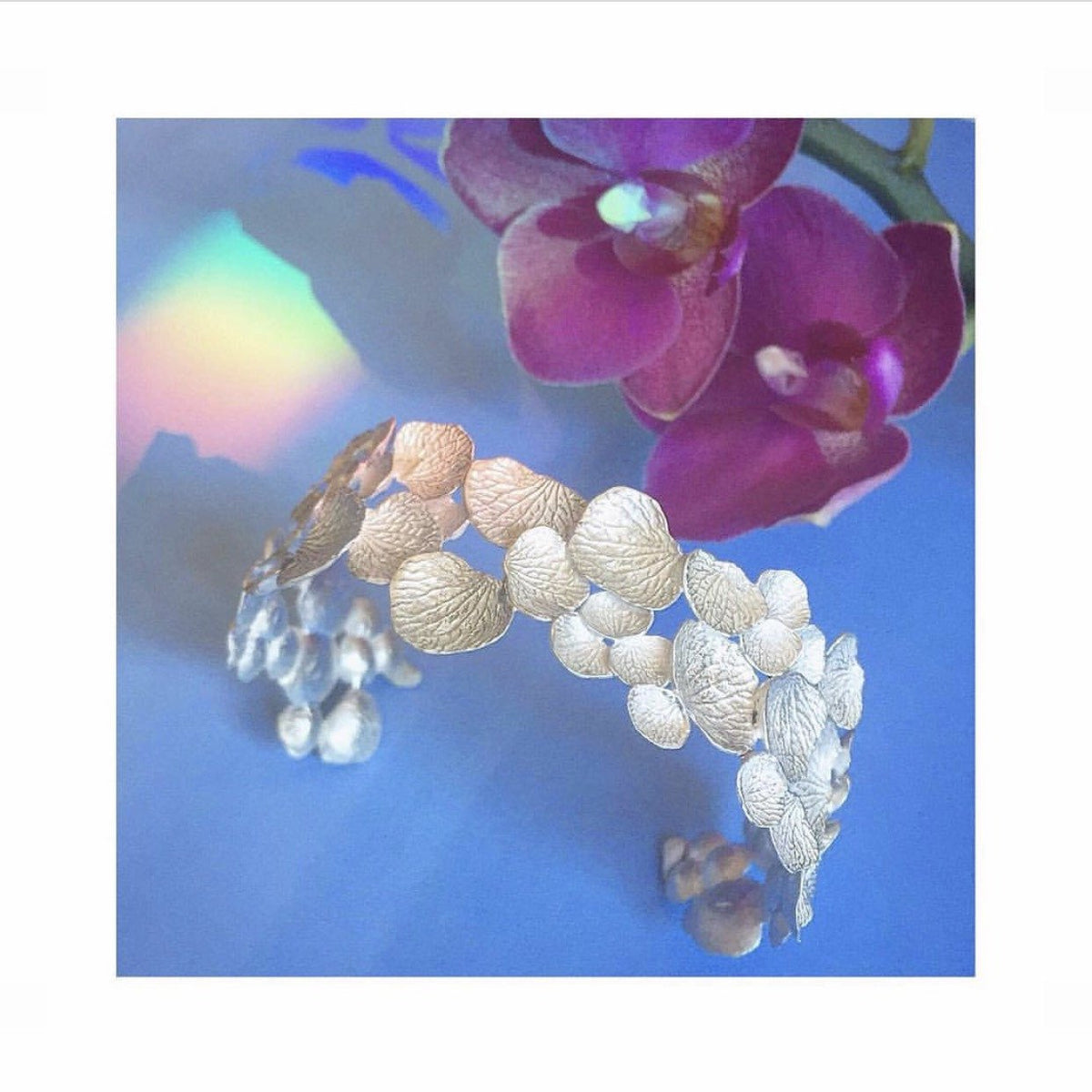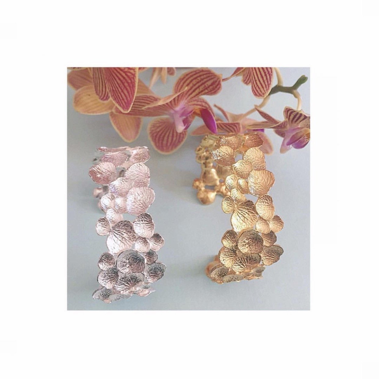 This Petal Cuff Bracelet by Catherine Weitzman is a sculptural ode to nature’s delicacy. Cast from real orchid petals, it captures their soft, organic texture in a bold and graceful form. A striking accessory that adds elevated elegance to any ensemble. Handmade in Hawaii.