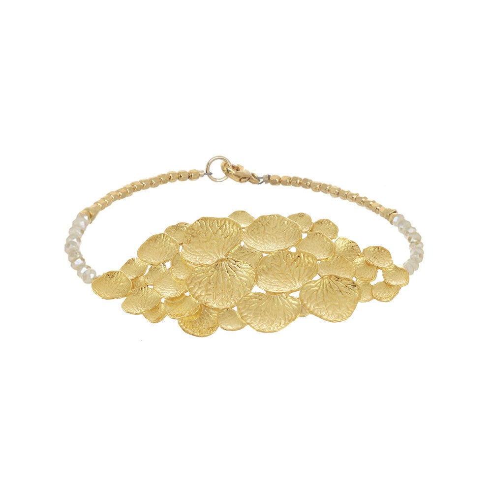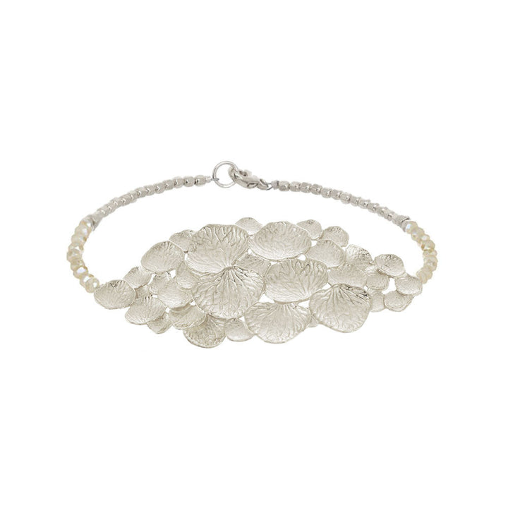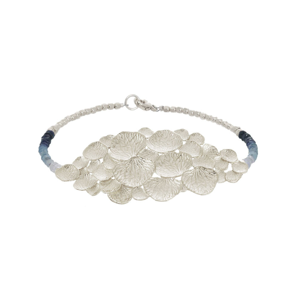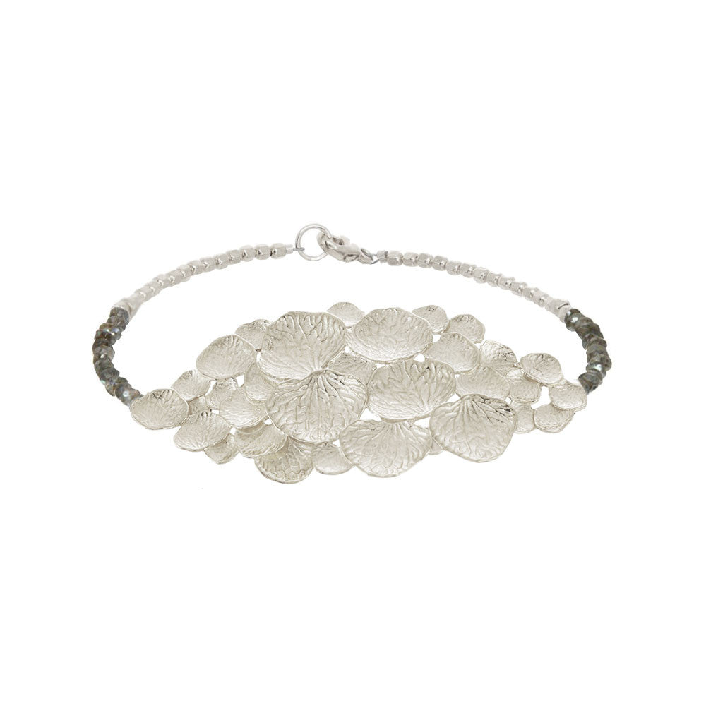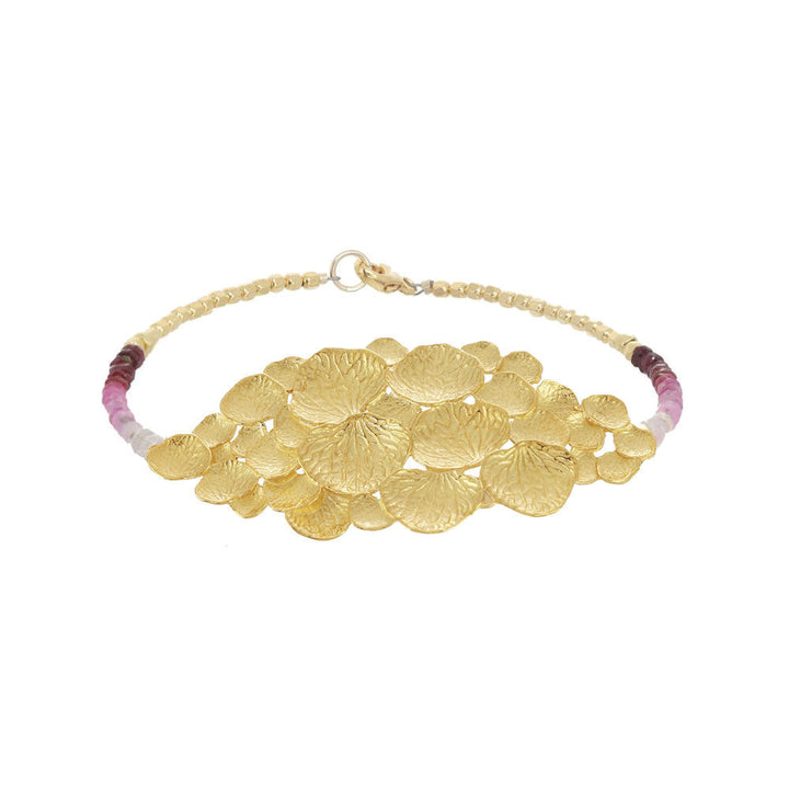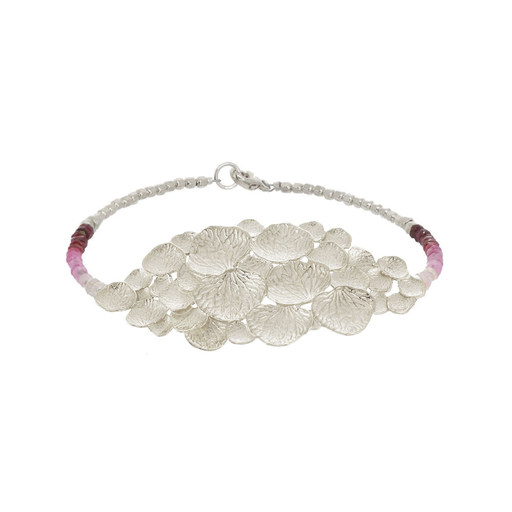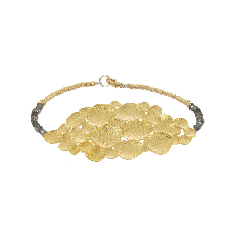 This Oval Petal Cluster Fade Bracelet by Catherine Weitzman merges natural beauty with gemstone radiance. Cast from orchid petals and accented with semi-precious stones, the design balances texture and sparkle. Ideal for layering, yet striking on its own, this bracelet brings botanical elegance to any collection. Handmade in Hawaii.