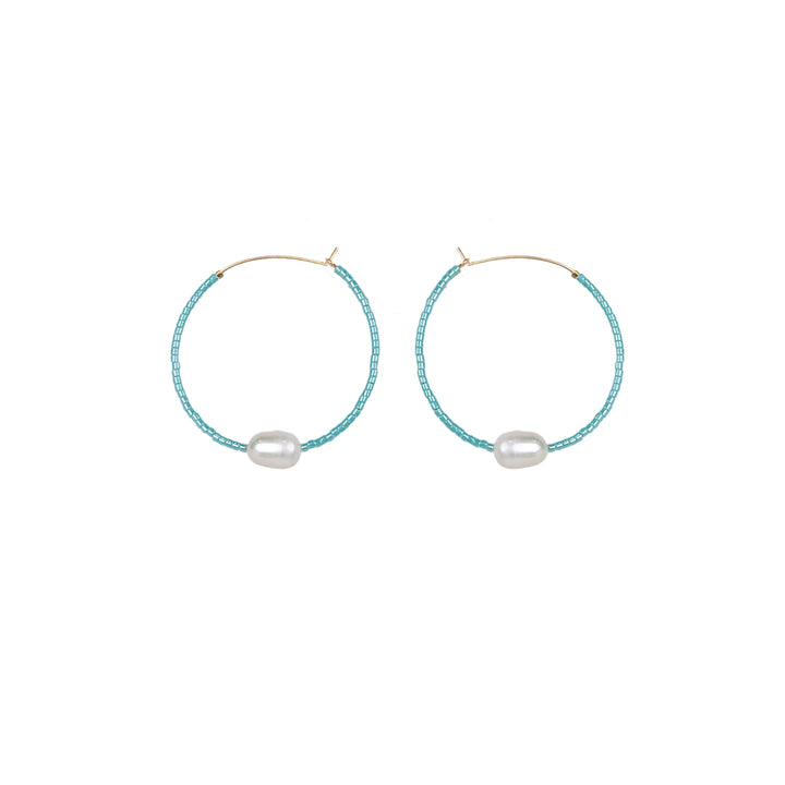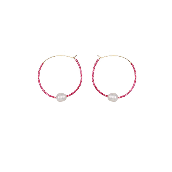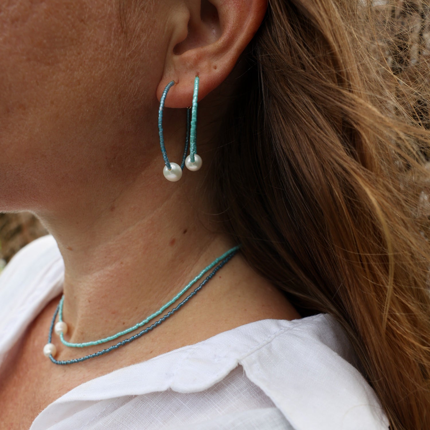 Handmade in Hawaii. Recycled sterling silver or 18k gold vermeil with freshwater pearl and sunrise-toned glass beads. Hoop size: 1.5 inches.