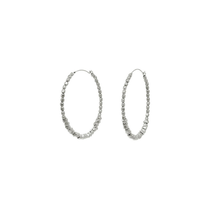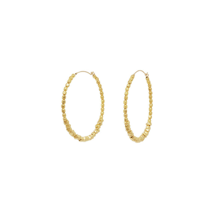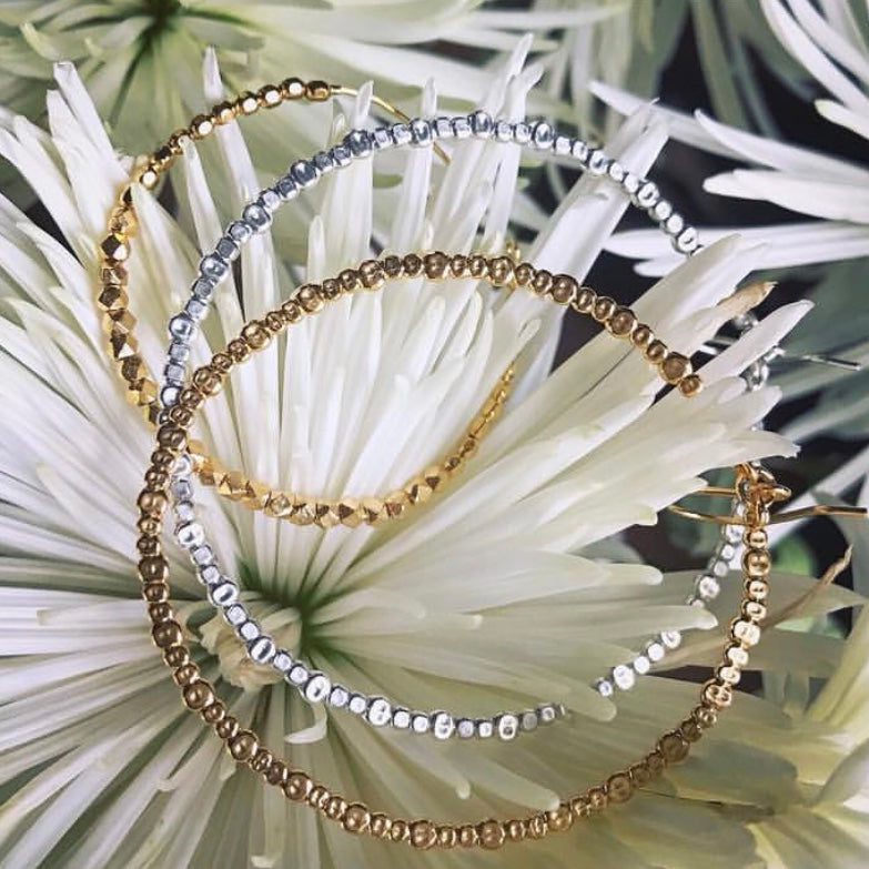 These Faceted Bead Hoop Earrings by Catherine Weitzman shimmer with subtle sophistication. Each faceted bead catches the light with every movement, creating a soft, dancing glint. Lightweight and elegantly scaled, these hoops make an effortless everyday statement.