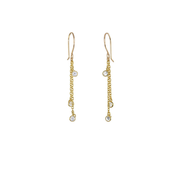These Mini Bezel Chain Earrings by Catherine Weitzman combine shimmering crystals with lightweight movement. Featuring three bezel-set white crystal stones on a gold-fill chain, they bring subtle sophistication and sparkle to any look.