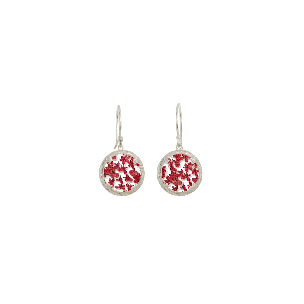 These Mini Flower Burst Earrings by Catherine Weitzman burst with color and nature's artistry. Set within dual-glass chambers, red pressed flowers bloom against a golden frame of organically styled branches, creating a lively and elegant display. Handmade in Hawaii.