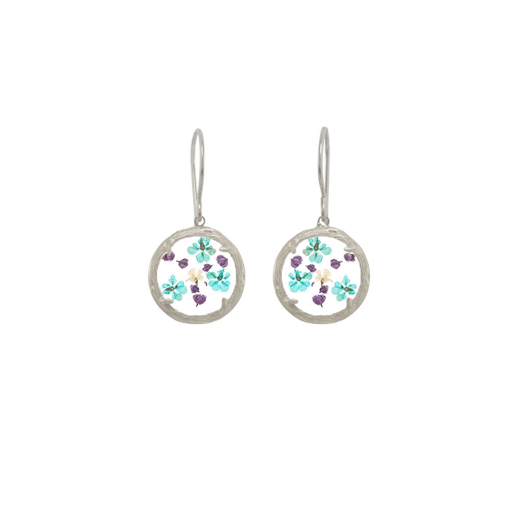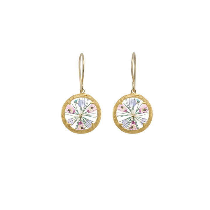 These Mini Mandala Earrings by Catherine Weitzman radiate spiritual elegance with their mandala-inspired floral design. Inside a softly textured gold frame lies a tiny universe of pressed flowers, offering a sense of calm and connection in every glance. Handmade in Hawaii.