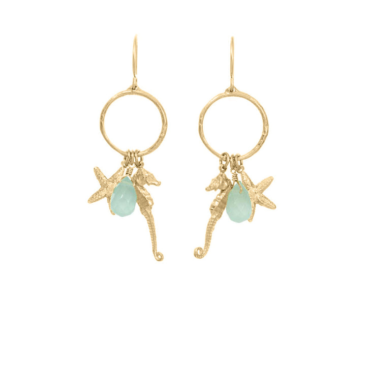 These Sealife Charm Earrings by Catherine Weitzman capture the whimsical allure of the ocean with an effortless grace. Part of the Seaside collection, the delicate seahorse and starfish charms are cast from actual marine life, bringing authenticity and intricate detail to every piece. Enhanced by soft blue chalcedony accents, these earrings evoke memories of summer strolls along the shore and days filled with salty air. Ideal for ocean lovers, their sweet scale and elegant design make them perfect for everyday wear or special seaside moments.