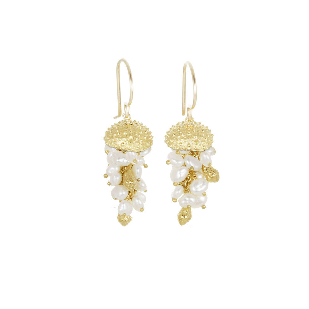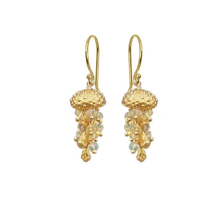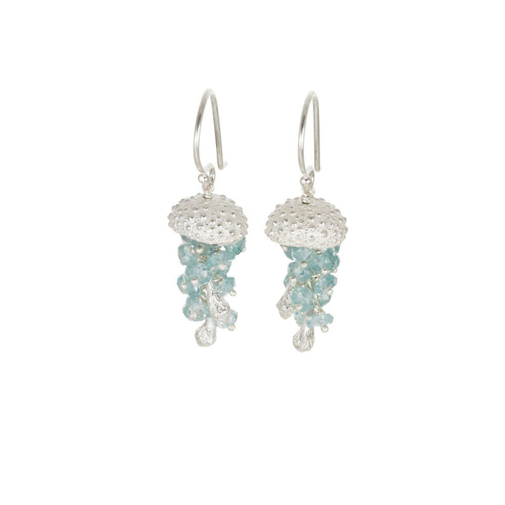 These Jellyfish Earrings by Catherine Weitzman transform marine magic into wearable art. The bodies, cast from real sea urchins, are paired with tentacles of glittering aqua gemstone rondelles, creating an enchanting display of color and movement. A whimsical piece for lovers of the sea.