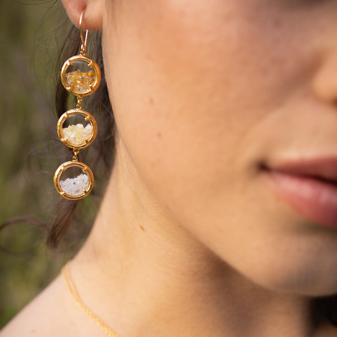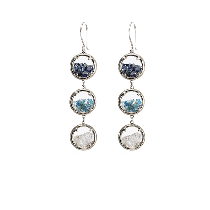 These Three Shaker Earrings by Catherine Weitzman bring kinetic elegance to your look. Three glass chambers, each filled with crushed sapphire, aqua apatite, and white topaz, dangle gracefully, catching light and color with every movement. Framed in textured metal, they offer vibrance and versatility.