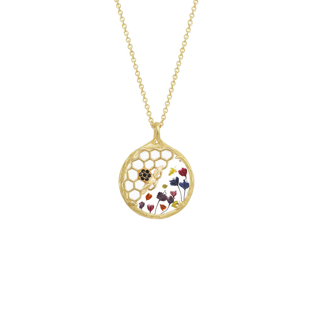 This Small Honeycomb Necklace by Catherine Weitzman is a delicate tribute to the quiet poetry of nature. Suspended in golden hexagonal form, real hand-pressed bridal wreath blossoms are preserved under watch glass—evoking grace, connection, and a timeless garden charm.
