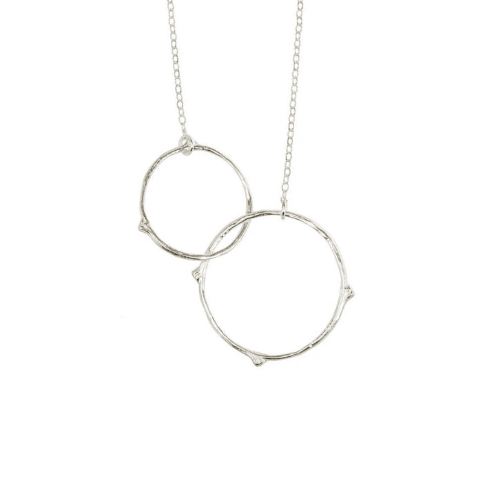 This Interlocking Branches Necklace by Catherine Weitzman is an ode to growth and connection. Cast from real forest branches, the two overlapping circles evoke unity and renewal, with delicate buds symbolizing the beginning of new journeys. Its softly textured finish captures nature's gentle resilience, offering a timeless piece perfect for daily wear. Handmade in Hawaii.